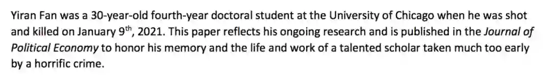 范依然是芝加哥大学一名博士四年级的学生,他于2021年1月9日不幸被枪杀,年仅30岁。这篇论文在《Journal of Political Economy》发表,反映了他正在进行的研究。因为一场可怕的罪行,他离开了我们,我们以此纪念这位才华横溢的学者的一生和他做过的工作。