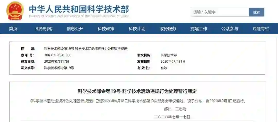 7 月 31 日,科技部正式公布 19 号令《科学技术活动违规行为处理暂行规定》,自 2020 年 9 月 1 日起施行。明确了 5 类违规主体,尤其是对于第三方的科学技术服务机构及工作人员,这是首次见到把范围的工作人员纳入违规主体里的;也明确了 6 类违规行为的具体行为,并且针对 6 类违规行为出了 10 大处理措施。