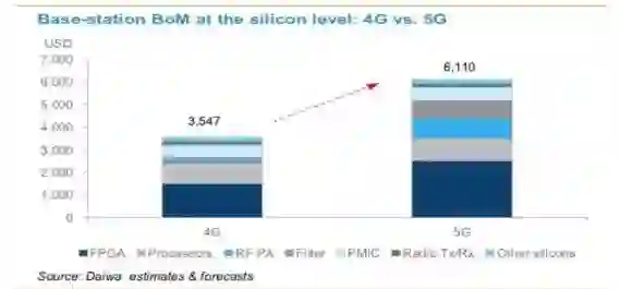 我们可以看到,一个5G基站对FPGA需求量几乎是一个4G基站需求量的两倍,5G基站硅的价值量约为4G基站的1.7倍,FPGA的价值量比4G基站多大约1000美元的价值量。