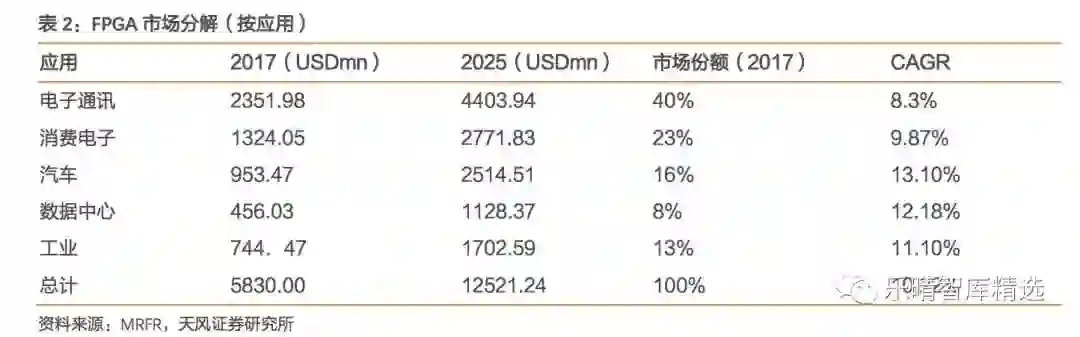 FPGA在电子通信领域增加带宽的应用有望得到迅速扩张,以5G+AI为主要应用场景的需求将迅速提升FPGA的市场容量。