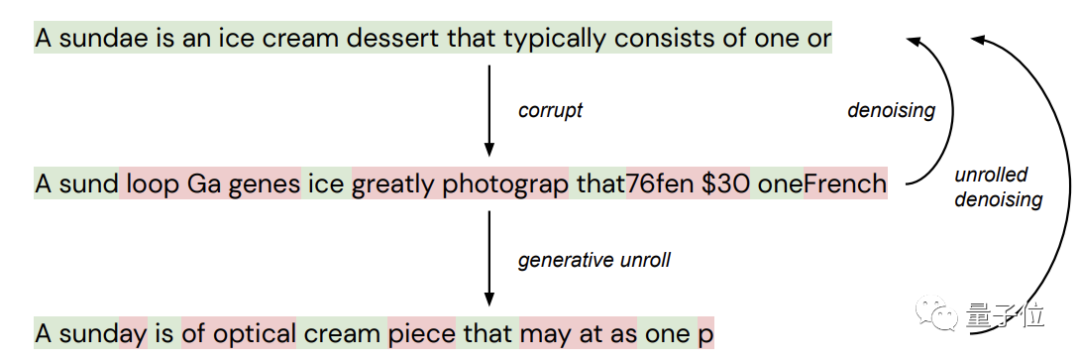而在文本生成期间,网络遇到的大多数文本都并非像上图中间那样,而是底部那种,所以展开降噪是非常有用的。