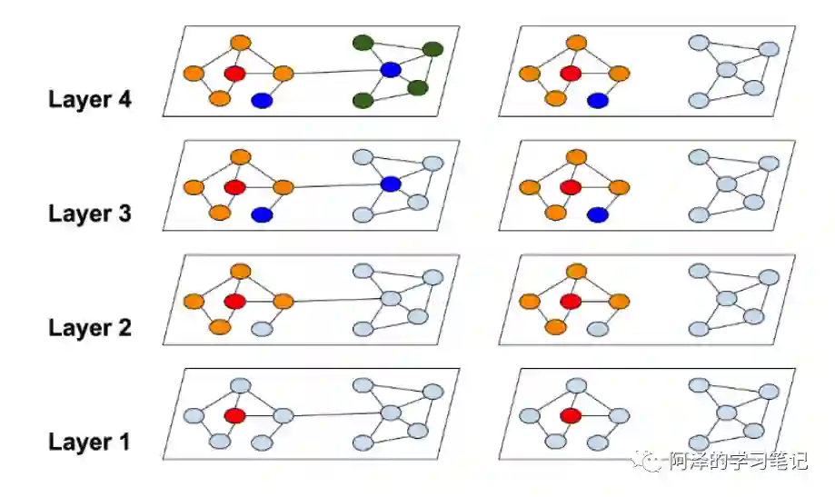 在计算节点 i 相关梯度时,需要节点 i 的 Embedding,而其计算需要依赖前一层邻居的 Embedding,而前一层的节点的 Embedding 需要前前一层的邻居节点的 Embedding,并如此嵌套下去,直至第一层。