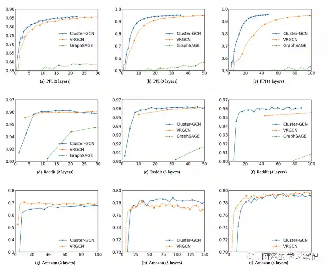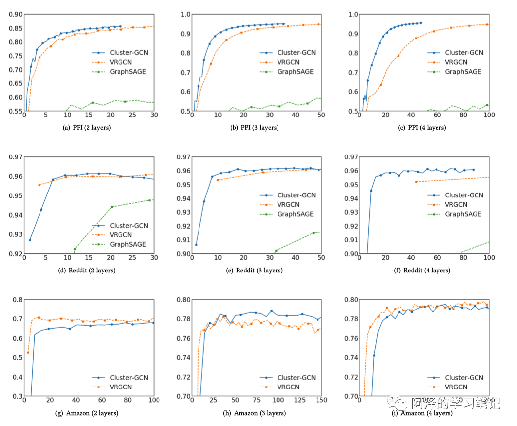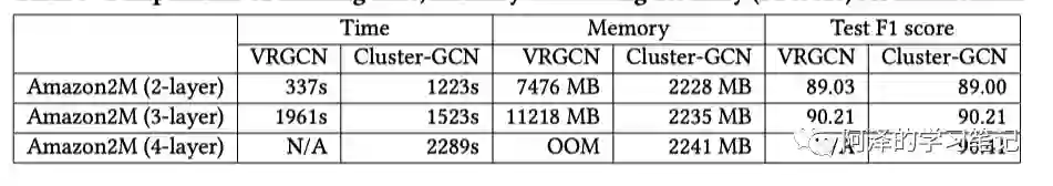 为了测试算法的可扩展性,作者创建了一个新的 Amazon 数据集,比之前的 Reddit 大五倍,并在该数据集上取得了更快、更少内存。此外,随着层数增加,Cluster-GCN 的预测精度也取得了 SOTA 的成绩。