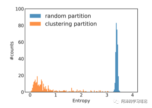 下图为 Reddit 数据集中标签分布不平衡的案例,通过每个簇的标签分布计算其熵值,与随机分割相比,可以清楚的看到聚类分区的簇的熵较小,这表明簇的标签分布偏向于某些特征的标签,所以这会增加不同 batch 的梯度更新的差异,并影响 SGD 的收敛性。