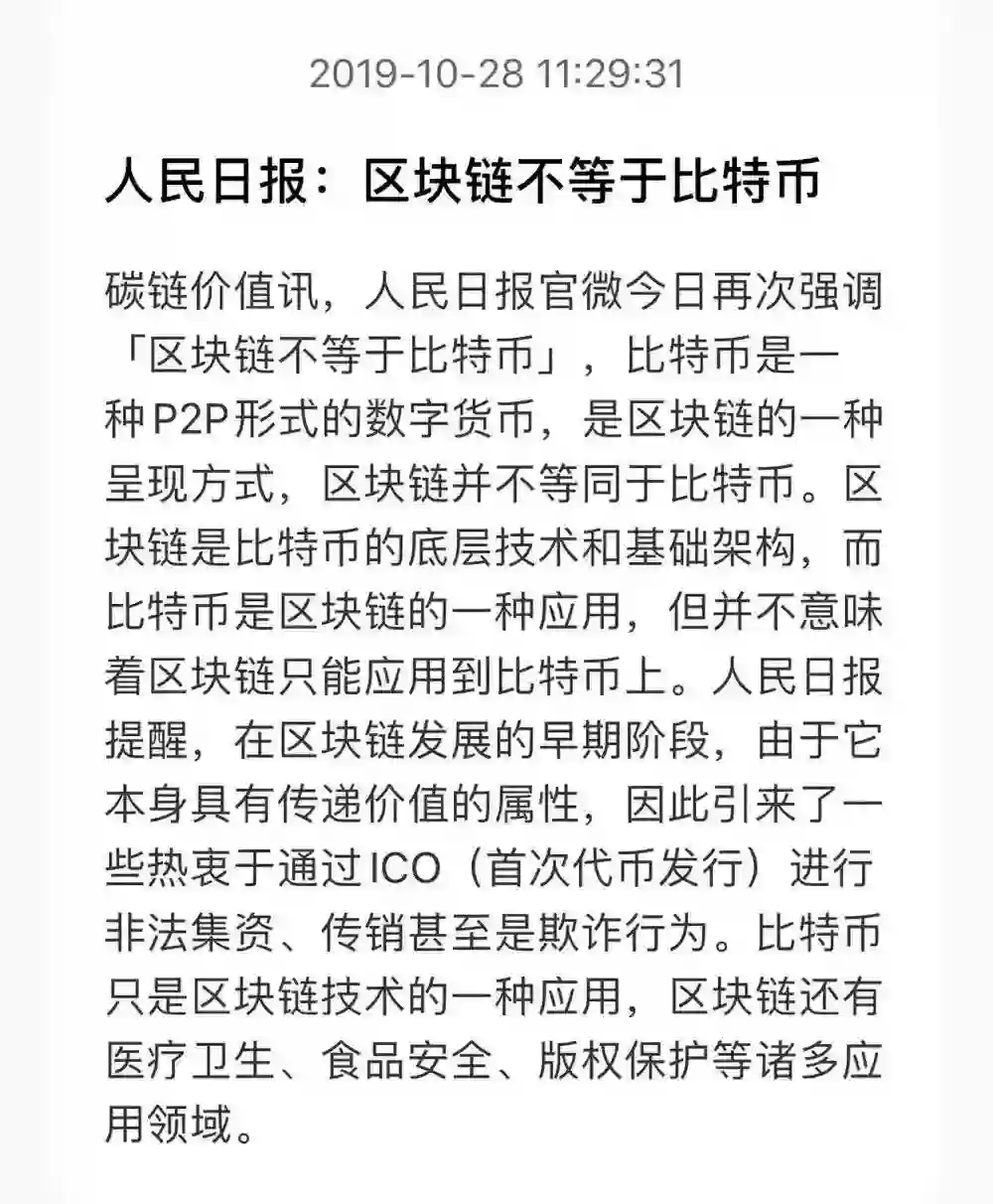 10月28日,人民日报也再次重申:区块链不等于比特币。