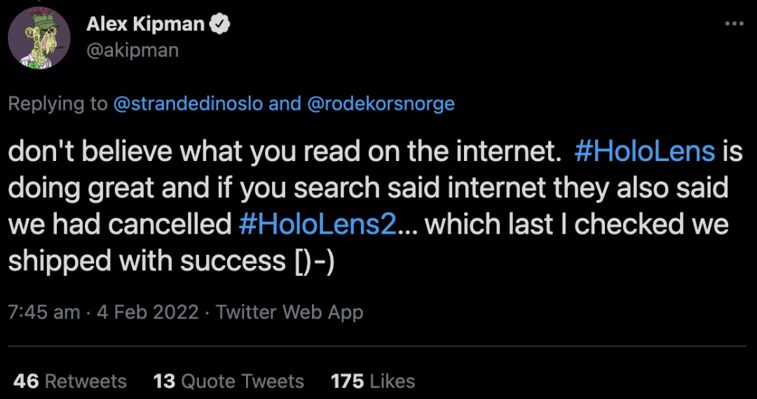 然而,微软发言人弗兰克·肖随即否认HoloLens项目已死。项目负责人阿列克斯·基普曼还在推特上说「不要轻信网上看到的消息,之前还有人说Hololens 2也被取消了咧」。