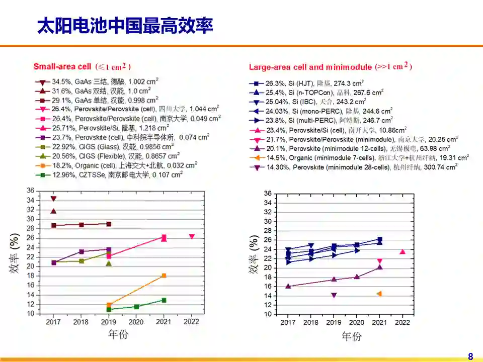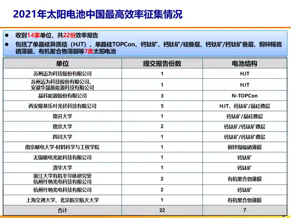 太阳电池中国最高效率已经发布了五届,2021太阳电池中国最高效率表将发表在由中国可再生能源学会光伏专业委员会主导编辑的年度《中国光伏技术发展报告》上。