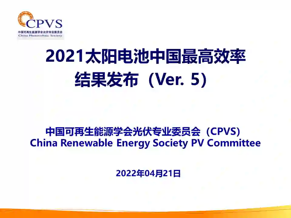 2022年4月21日,第十九届中国光伏学术大会(CPVC19)线上会议正式开幕!中国可再生能源学会光伏专业委员会(CPVS)在开幕式上发布了2021年太阳电池中国最高效率(CPVS Best Research-Cell Efficiencies)。