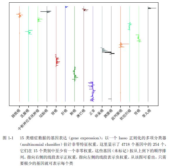 第 3 章会在这些数据上采用基于 lasso 正则化(lasso-regularized)的多项分类 器来实现该目标。这会对 15 个类中的每一个生成 4718 个权重(或系数),以便在 测试时进行区分。由于采用了 f1 惩罚,这些权重仅有一部分不为零(这取决于正则 化参数的选取)。可通过交叉验证(cross-validated)来估计最优的正则化参数,图 1-1 显示了由此所得的权重。图中仅有 254 个基因有非零的权重。对该分类器进行 的交叉验证,所得误差率约为 10%。也就是说,它能正确预测 90%的样本类别。相 比之下,使用所有特征的标准支持向量机误差率(13%)稍高一些。lasso 所具有的 稀疏性会在不牺牲精度的情况下大幅减少特征数量。稀疏性也提高了计算效率:虽 然可能要估计 4178 × 15 ≈ 70 000 个参数,但图 1-1 的整个计算在一个普通笔记本 上不到一分钟就可完成。第 3 章和第 5 章所介绍的 glmnet 程序包可以完成相关计 算。
