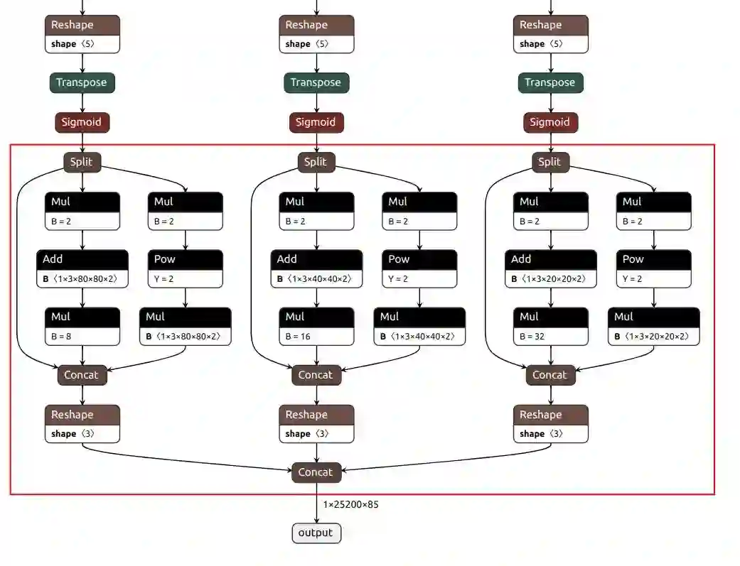 YOLOv5有3个检测头,如果模型输入尺寸为640x640,那么这3个检测头分别在80x80、40x40和20x20的特征图上做检测。让我们先用Netron工具来看一下YOLOv5 ONNX模型的结构,可以看到,YOLOv5的后处理操作已经被包含在模型中了(如下图红色框内所示),3个检测头分支的结果最终被组合成一个张量作为输出。