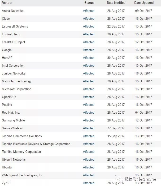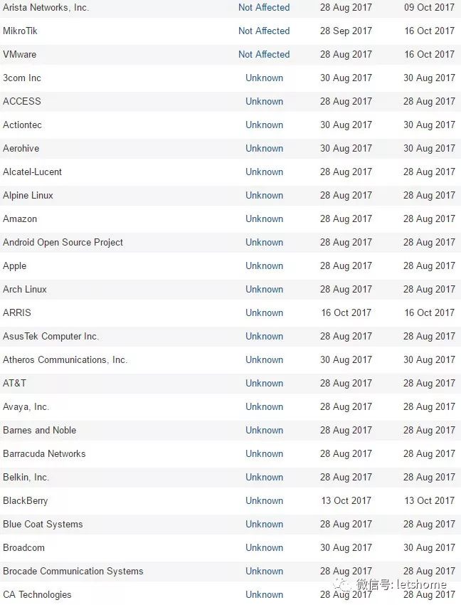 这里有一张美国cert 发布的受影响厂商列表(文中只列举了目前确定受影响的厂商和确定未受影响影响的厂商,其他厂商目前是否受影响情况未知。