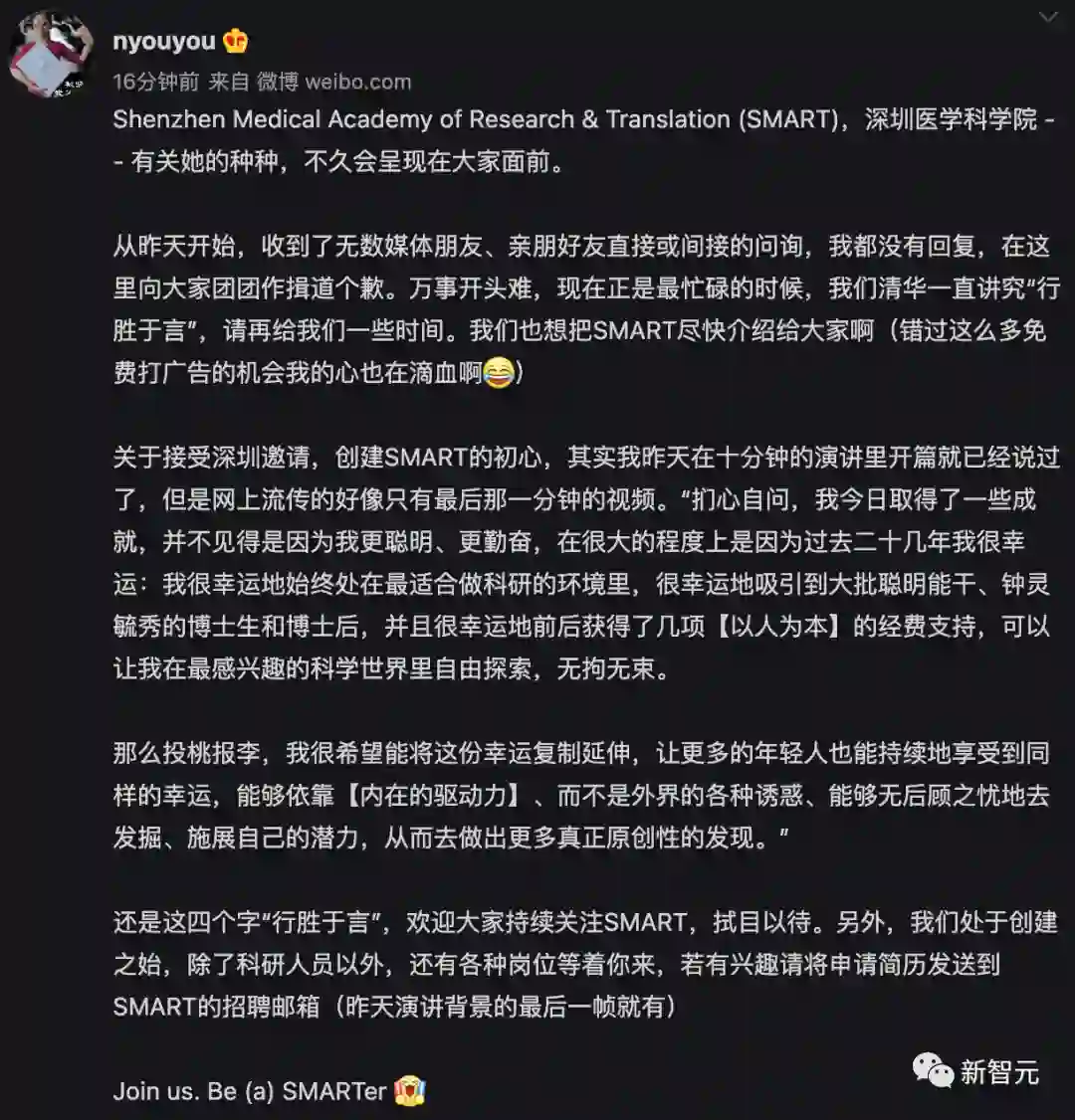 她说,自己是个幸运的人,希望将这份幸运传递给更多年轻人,同时也欢迎大家关注深圳医学科学院 (SMART)。
