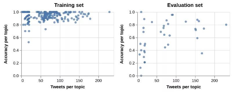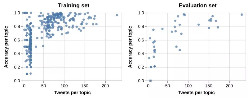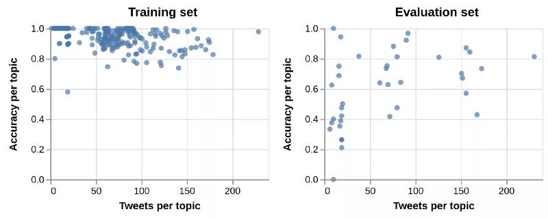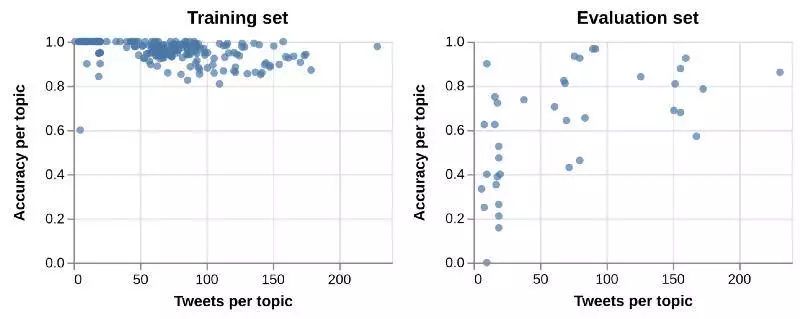 但是,要看真正的效果究竟如何,需要看每个主题的准确性。对于训练集来说,现在准确率与主题中的推文数量几乎无关,大多数主题都接近于 1。