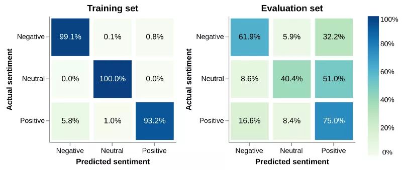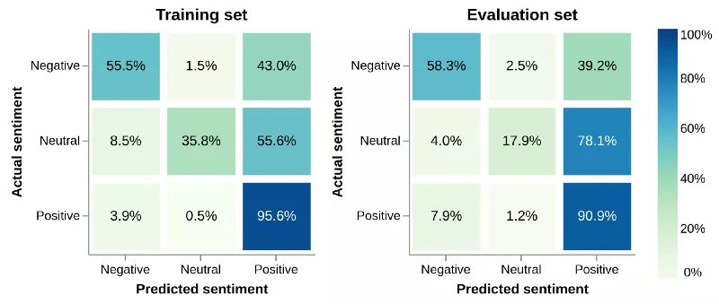 理想情况下,对角线应接近 100%,这意味着几乎所有推文的预测情绪都是正确的,但即使是训练集中,也会存在很大的非对角线元素。这表明了即使模型知道正确的情绪,也会更倾向于在大多数情况下默认预测积极情绪。43% 的消极情绪的推文和 55% 以上的中立情绪的推文被预测为积极情绪。这对于分别为 39% 和 78% 的评估集来说更加槽糕。