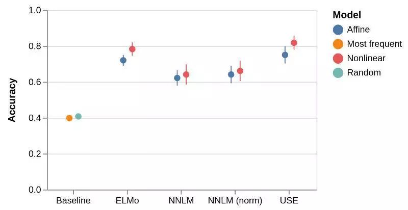 在这里,有很多有趣的观察等待我们去做。首先,在基线之上的任何嵌入的模型都有很大的改进。因此,正如所预期的那样,嵌入这个词捕获了可以用来推导推文情绪的信息。其次,转向 NNLM 嵌入,使用非线性模型似乎并没有什么改进。这很有趣,因为它表明了嵌入空间足够简单,仿射模型能够使用嵌入中所有可用的情绪信息。这与最新的嵌入方法 ELMo 和 USE 形成了对比。在 ELMo 和 USE 中,我们确实观察到在非线性模型的使用情况有所改善,这表明这些模型学习的嵌入空间更加复杂。对于 NNLM,归一化向量确实比非归一化向量有更好的表现趋势,但是在我们的实验中,效果并不显著。最后,虽然 ELMo 和 USE 都包含比 NNLM 嵌入更多的信息,但它们在这些实验中的表现却非常相似。USE 似乎通常包含比 ELMo 略多的信息,但也并没有多多少。然而,这仍然很有趣,因为 USE 嵌入空间的维数比 ELMo 空间要低得多,因此,模型训练速度要快得多。