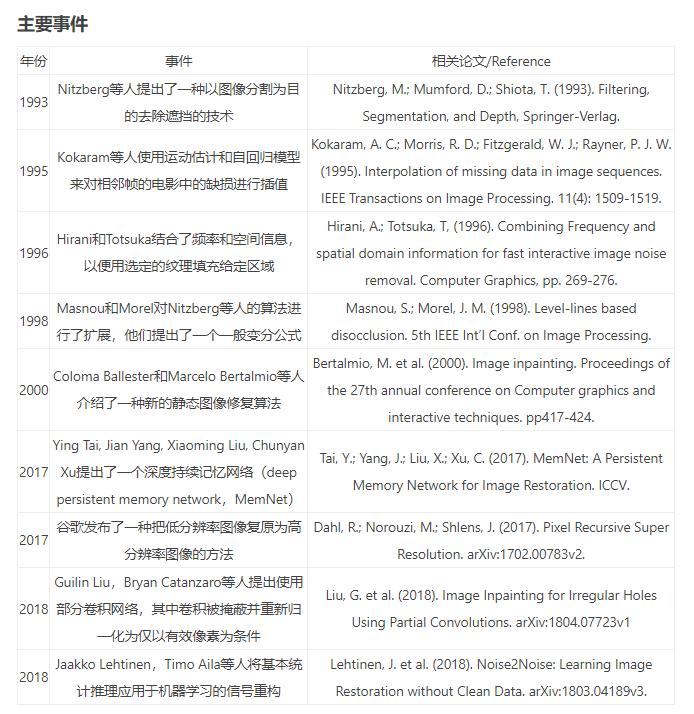数字修复中的 AI 技术应用要比想像的多 上述图像分辨率补充、FPS 提升、色彩填充是数字修复大方向下的三个子环节,而整个影像修复技术处处可见人工智能的身影。 以图像修复为例,一般步骤为:输入图像,检测画面信息及获得画面所有像素并识别受损区域,计算受损区域的像素点优先项,确定优先项最高的为待修复像素块,计算源区域中的匹配块与待修复区域的误差,确定误差值最小的为最佳匹配,进行填充和修复,检测损伤区域是否全部修复,若已修复则输出图像。