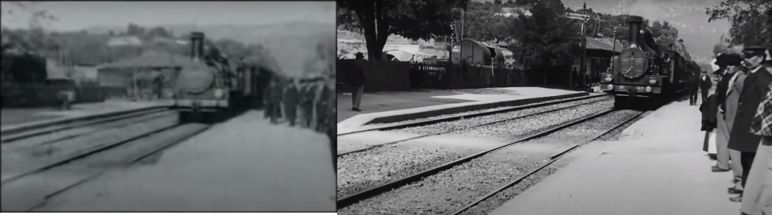 视频修复前后在色彩、清晰度方面都有了很大的提升,修复前灰蒙蒙,修复后色彩鲜艳。 那么从技术层面上看,究竟是如何做到这么惊艳的效果的呢?阿婆主表示,他也是参考了海外 YouTube 博主 Denis Shiryae 的影像修复教程。 影像修复三大步骤 今年年初,Denis 修复 1896 年经典电影的视频也在海外火了一把。 电影界最著名的短片之一是 1896 年的一部无声电影《L’Arrivée d’un train en gare de La Ciotat》,画面很简单,只有 50 秒,描述的是一列火车驶入车站的场景。Denis 正式对这个经典的短片进行了 AI 修复,效果非常不错。下图可以看出修复前后画面的强烈对比: