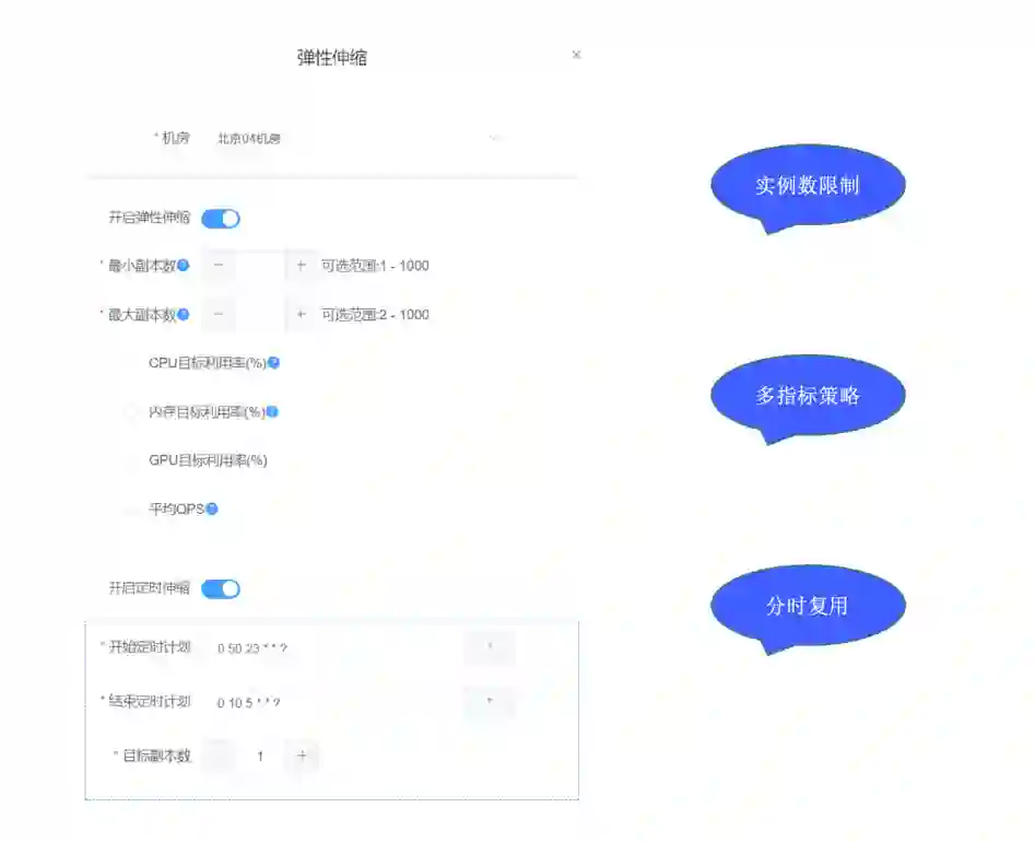 (1)常规弹性伸缩:包括 CPU 利用率、内存利用率、GPU 利用率、平均 QPS,并且伸缩策略都支持配置 伸缩区间(最小副本数 <= 伸缩目标副本数 <= 最大副本数)。