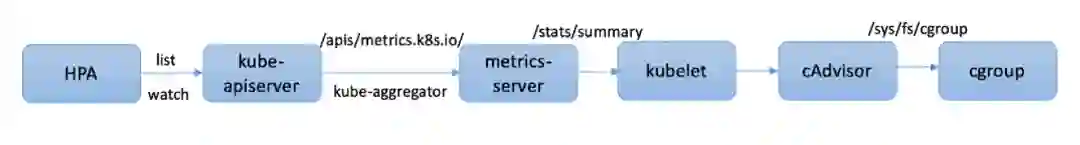 CPU/Memory 弹性伸缩中,我们只使用平均利用率类型的伸缩指标,整体数据流程如图所示: