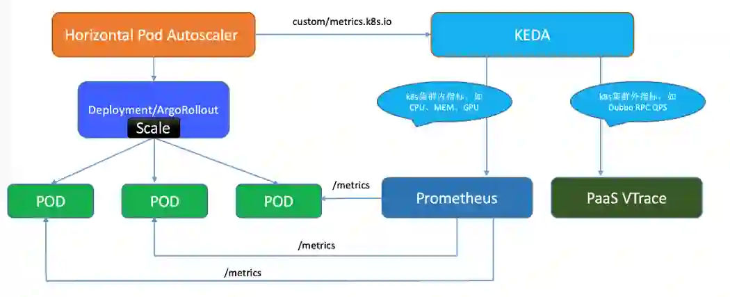 (1)集群 Pod 部署会采用多种 workload(deployment、argoRollout、statefulset 等),KEDA 均支持这些伸缩对象,最终实际生效对象其实是 /scale 子资源;
