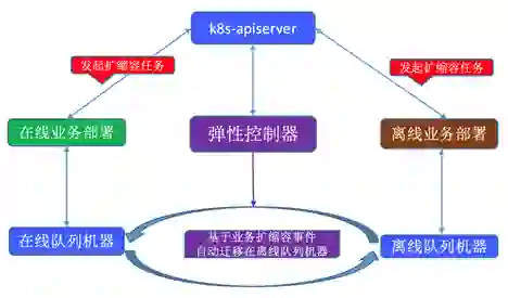 (1)弹性控制器基于 kubernetes controller 标准范式开发,一直监听在线业务的扩缩容事件,并且自动迁移在离线资源池机器;