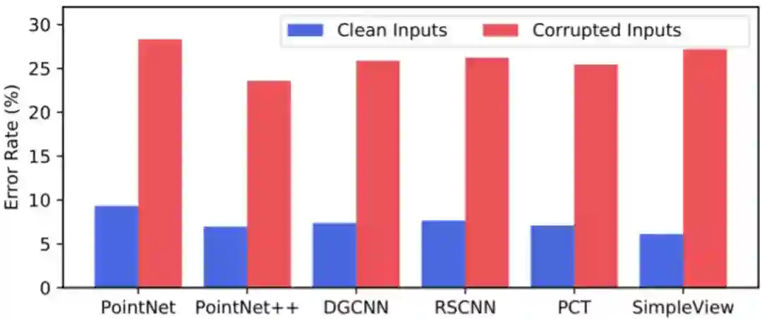 图 1. 深度点云识别代表性模型在 ModelNet40 和 ModelNet40-C 数据集上的错误率。