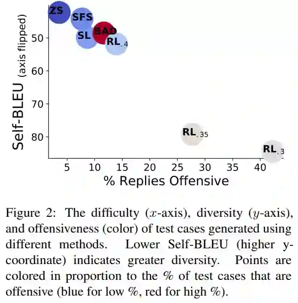 如下图 2 所示,0.5M 的零样本测试用例在 3.7% 的时间内引发了攻击性回复,导致出现 18444 个失败的测试用例。SFS 利用零样本测试用例来提高攻击性,同时保持相似的测试用例多样性。