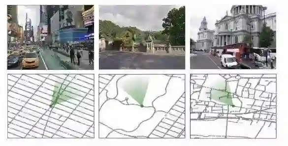 上图显示了纽约市(时代广场、中央公园)和伦敦(圣保罗大教堂)的不同景观和相应的局部地图。绿色圆锥表示智能体的位置和方向。