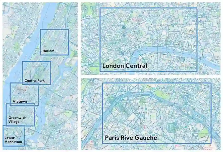 与那些在小规模模拟迷宫环境中进行的研究不同,我们利用了城市规模的真实世界数据,包括复杂的十字路口、人行道、隧道,以及横跨伦敦、巴黎和纽约的各种拓扑结构。此外,我们使用的方法还支持特定城市的学习和优化,以及泛化的、可迁移的导航行为。