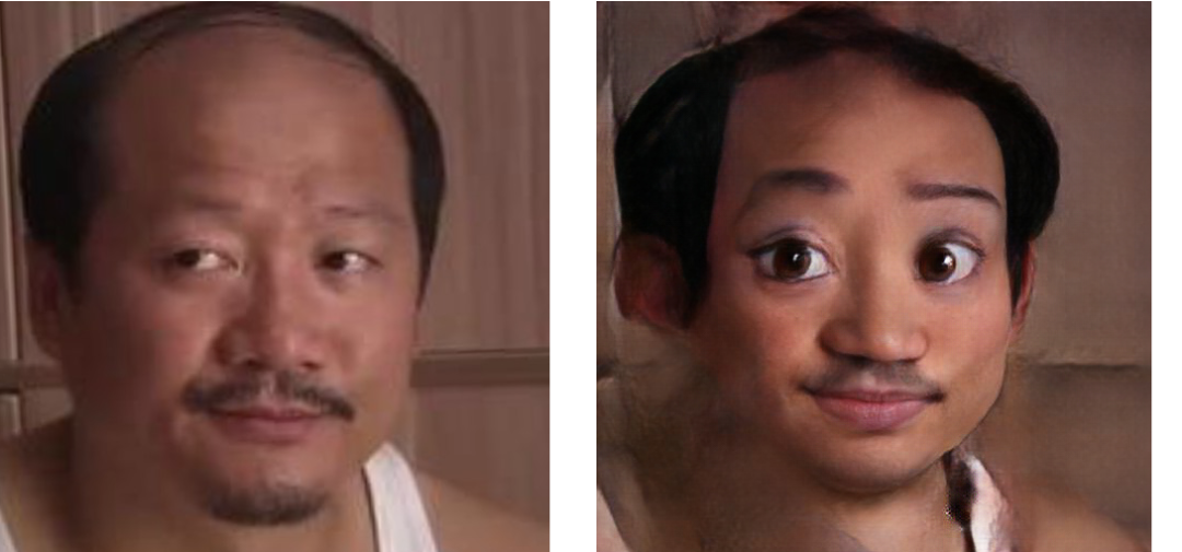 让原始StyleGAN2生成了一堆真实人脸,让迪士尼版StyleGAN2生成了一堆卡通脸。就这样,用一对对的数据为AI提供训练素材。