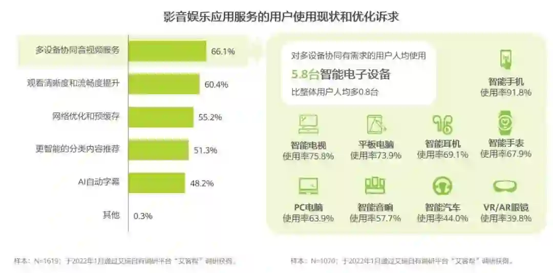 此外白皮书还显示,66.1%的用户期望多设备协同音视频服务(如点播共享、快捷连接投屏等功能)可以进一步提升,此类用户人均使用5.8台智能电子设备,高于整体水平。可以看到,快速增长的使用时长,高占比的细分领域,超高的渗透率,用户需求的变化等,无不在预示着智能化应用需求拐点的到来,也说明多设备协同是影音娱乐应用发展的一大方向。
