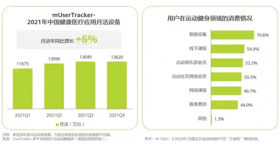 而在运动健康行业中,危机之下潜力巨大。健康医疗类应用的月活设备数量于21年同比增长6%,其在智能设备中的付费率最高,达到了70.6%,这表明在高渗透率下,持续迎来增长的同时,运动健康行业的商业价值可观。
