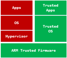 在移动端,ARM芯片占据了主流市场,ARM芯片提供了名为TrustZone技术的技术,在硬件层面新增一个可信计算环境,包含一个可信OS,和一些可信APP,和普通环境在硬件层面隔离,处理器内部进行通信完成两个世界的交互。