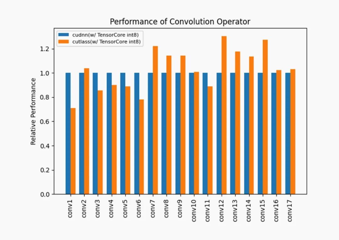 cutlass 在选取的 17 个卷积层下有 11 个卷积层的性能超过了 cudnn,余下的 6 个卷积层的性能也基本达到了 cudnn 的 80%以上。