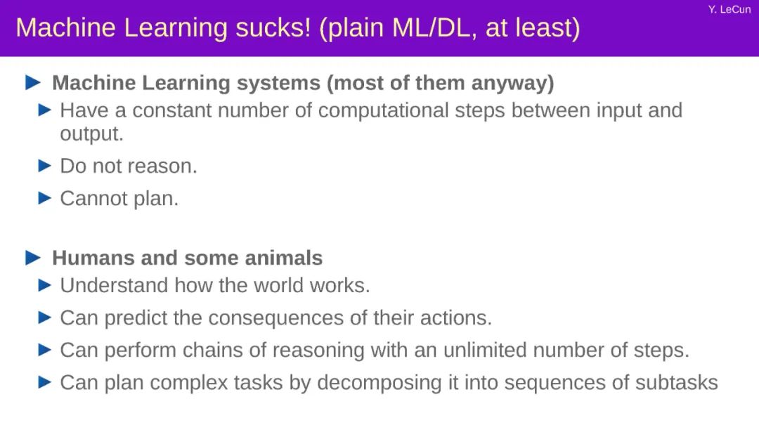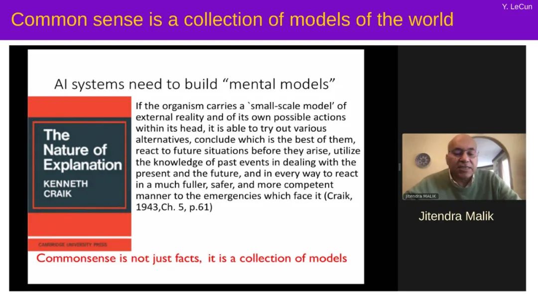 在演讲中,Yann LeCun将基于一种新的模块化认知架构和一种有点新的自监督训练范式,提出一种通向自主智能agent的可能路径。提出的体系结构的核心是一个可配置的预测世界模型,它允许智能体进行计划。行为和学习是由一组可微的内在成本函数驱动的。世界模型使用了一种新型的基于能量的模型体系结构,称为H-JEPA(分层联合嵌入预测体系结构)。H-JEPA学习世界的分层抽象表示,这些表示同时具有最大信息量和最大可预测性。