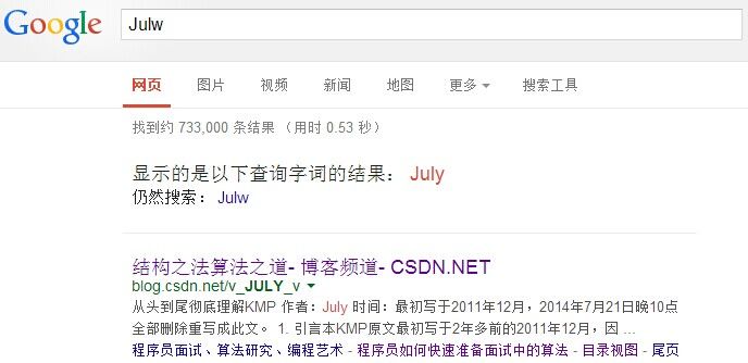 经常在网上搜索东西的朋友知道,当你不小心输入一个不存在的单词时,搜索引擎会提示你是不是要输入某一个正确的单词,比如当你在Google中输入“Julw”时,系统会猜测你的意图:是不是要搜索“July”,如下图所示: