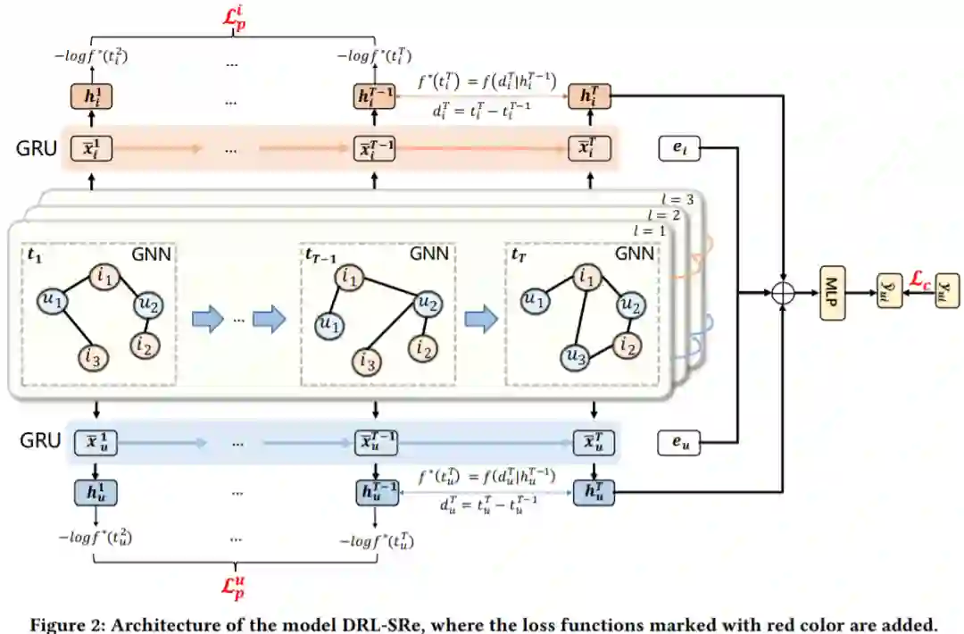 如图所示为所提方法DRL-SRe的整体框架图,时间切片的图神经网络用于从序列数据中学习user和item的表征。将从时间序列中得到的表征和静态表征结合后用于预测。