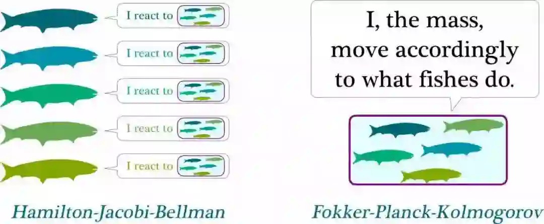 如果我们用数学方程表述这个原理,一方面可以用 Hamilton-Jacobi-Bellman 方程来描述鱼对周边鱼群的反应,另一方面则可以用 Fokker-Planck-Kolmogoroy 方程来表示决定整个鱼群行动的所有鱼的行为集合。