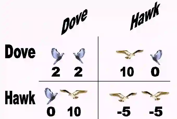 EGT 的经典案例是鹰鸽博弈(Howk Dove Game),它模拟了鹰与鸽之间对可共享资源的竞争。博弈中的每个竞争者都遵循以下两种策略之中的一种: