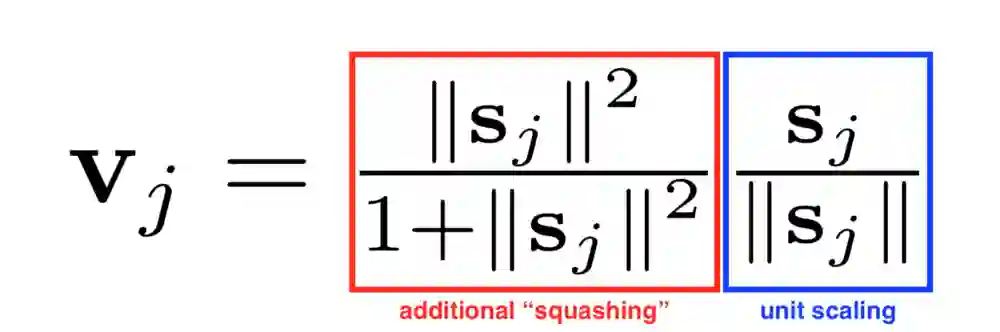 公式右边的蓝色矩形缩放输入向量至单位长度,左边的红色矩形进行一些额外的缩放。记住,输出向量的长度代表胶囊检测的给定特征的概率。