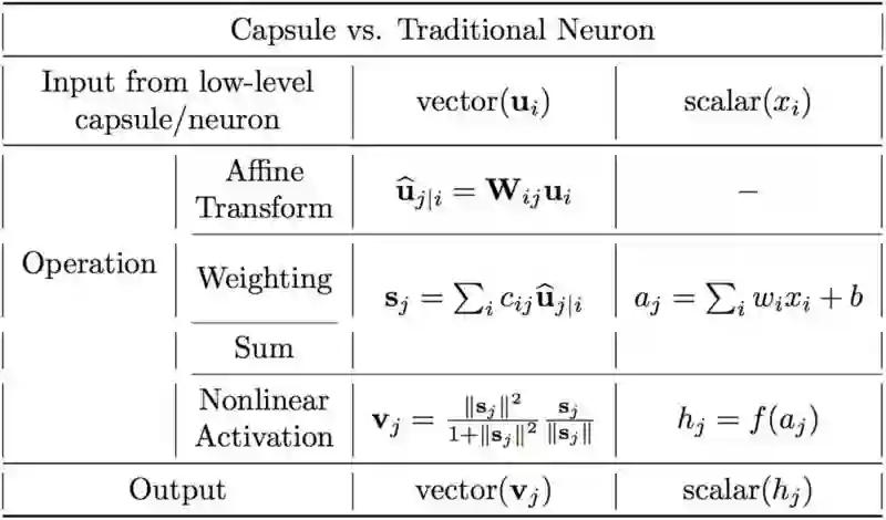 让我们比较下胶囊与人造神经元。下表总结了胶囊和神经元的不同: