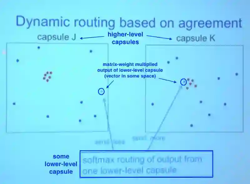 所以,低层胶囊该把它的输出发给胶囊J还是胶囊K呢?这个问题的答案正是动态路由算法的精髓。低层胶囊的输出乘以相应的矩阵W后,远离胶囊J中“正确”预测的红色聚集,另一方面,在胶囊K中,它将落在非常接近于“真”预测的红色群组中。低层胶囊具备测量哪个高层胶囊更能接受其输出的机制,并据此自动调整权重,使对应胶囊K的权重C变高,对应胶囊J的权重C变低。