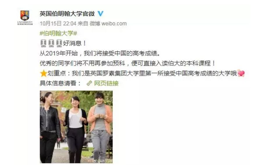 近日,英国伯明翰大学宣布,将从2019年开始接受中国高考成绩。要求为高考总分达到600分、高中学业水平测试成绩达到85%。此外,根据所申请专业不同,雅思成绩最低要求为6.0-7.0。如条件符合,将免除预科直接录取。此前,高中生本科留学通常需要在开课前进行一年或半年的预科学习。