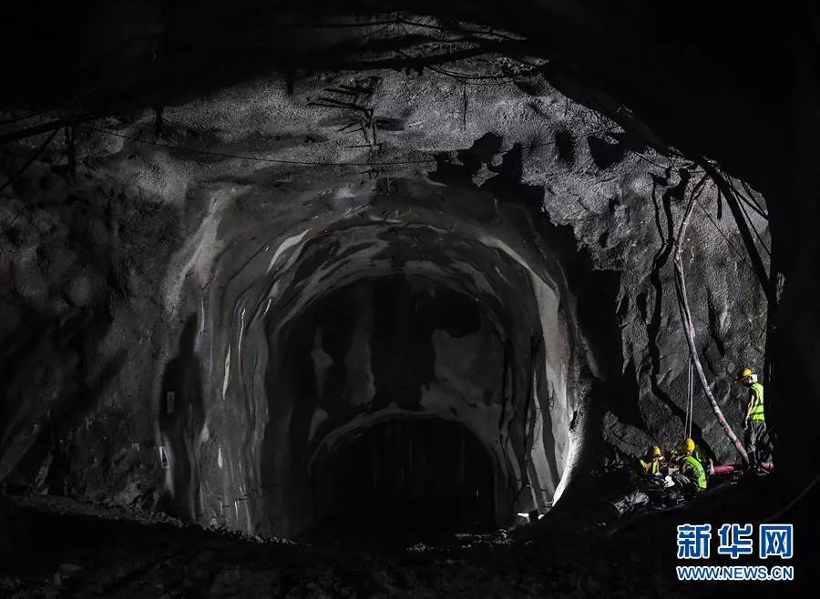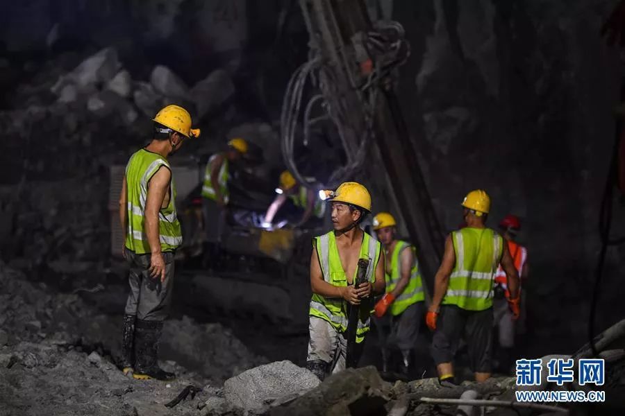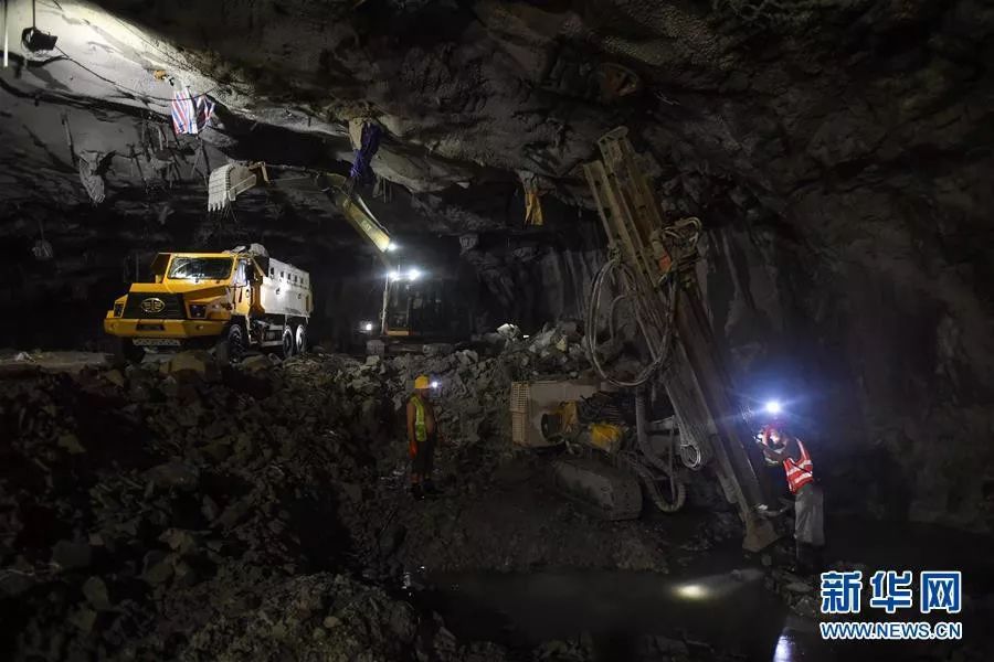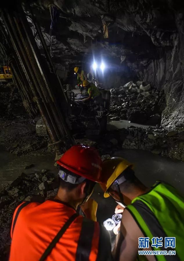 中国水电六局工程人员在700米深的江门中微子实验地下实验室进行中导洞施工(6月23日摄)。新华社记者 刘大伟 摄