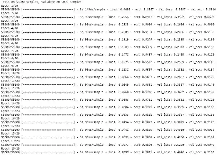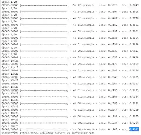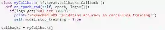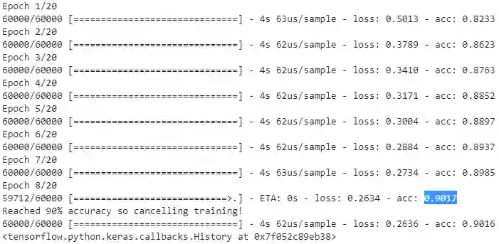 在本例中,我们定义的是 on_epoch_end(),在每期结束式,一旦精度超过 90%,模型就停止训练。