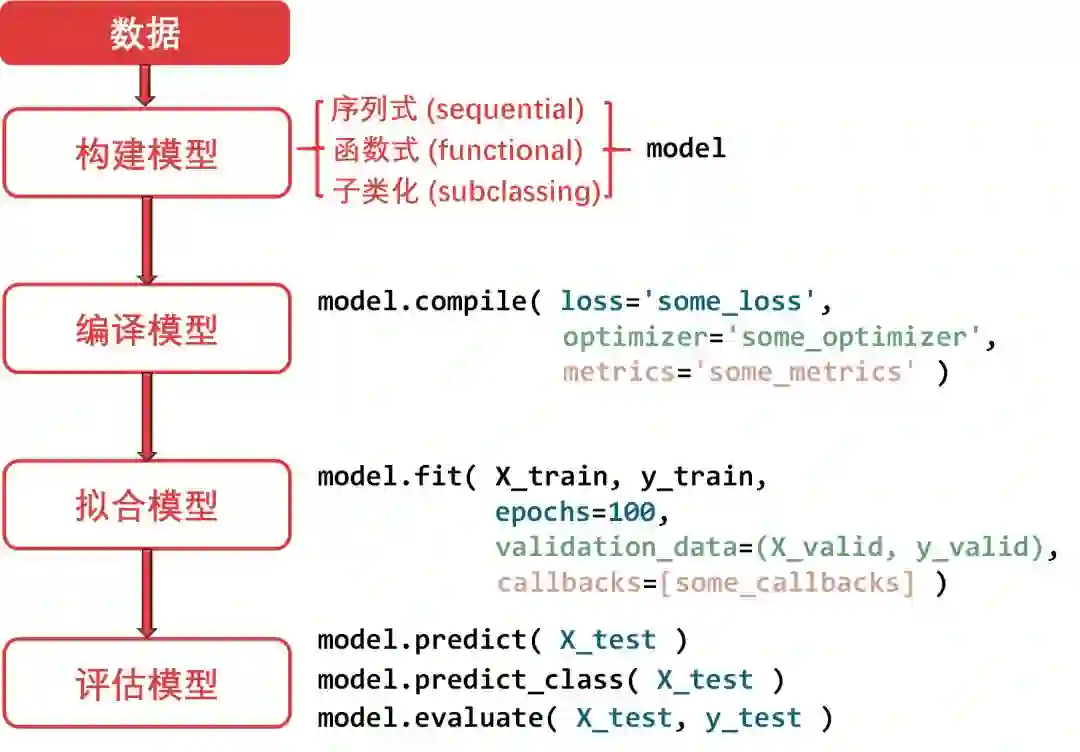 损失函数和算法都会在 Keras 里面都会显性定义出来,带着上面 Scikit-Learn 的图,让我们来看看 Keras 的高层流程。