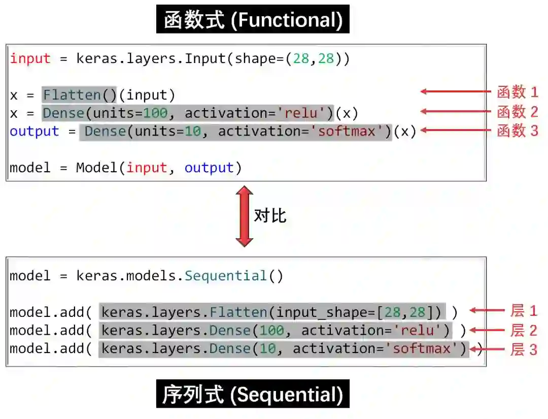具体来说,它们都是声明哪些层应该按什么顺序来添加,层与层以什么样的方式连接,所有声明完成之后再给模型喂数据开始训练。这种方法有好有快。