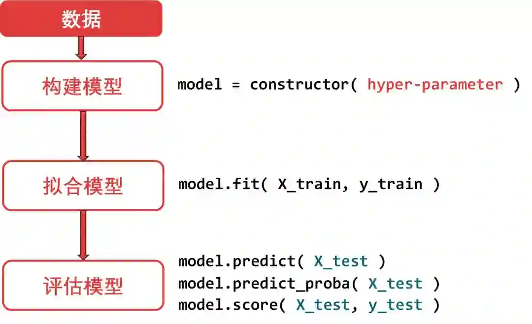 除了数据和模型,要完成一个任务还需定义损失函数(loss function)和指定算法(algorithm),它们都隐藏在 Scikit-Learn 的具体模型中,比如