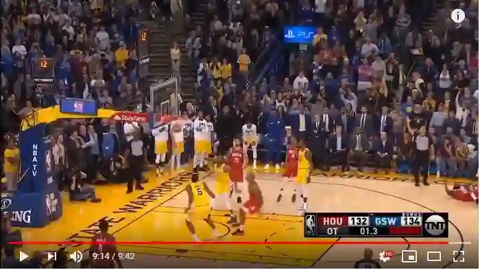 下面一个 9:42 秒的 1280 x 720 油管视屏 (哈登三分绝杀勇士),被分解成 40 个样本数据,每个样本包括 240 帧。这样的视频剪辑将存储在形状为 (40, 240, 1280, 720, 3) 的张量中。