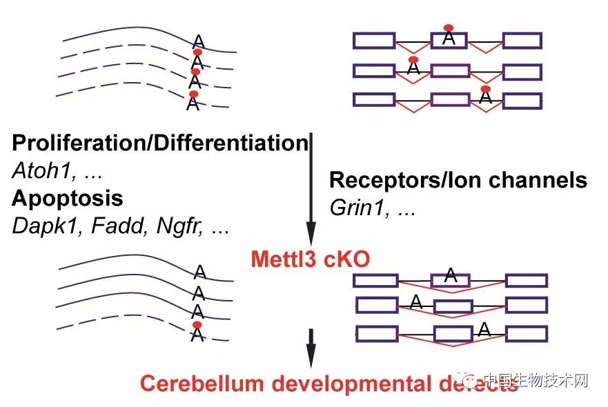 中国科学院遗传与发育生物学研究所王秀杰研究组与中国科学院动物研究所周琪研究组、中国科学院北京基因组研究所杨运桂研究组通过合作研究发现,在中枢神经系统通过Nestin-Cre特异地敲除Mettl3导致小鼠出现严重的运动功能障碍,并伴随哺乳期死亡。解剖和病理切片检测发现由Mettl3敲除引起的m6A甲基化修饰的缺失严重影响大脑皮层和小脑的发育,导致大脑皮层变薄和小脑萎缩。进一步研究发现,m6A甲基化修饰的缺失引起小脑内颗粒神经元分化和成熟过程中基因表达调控紊乱,最终导致颗粒神经元大量凋亡。该研究揭示了METTL3介导的m6A修饰调控在哺乳动物中枢神经系统发育中的重要作用。